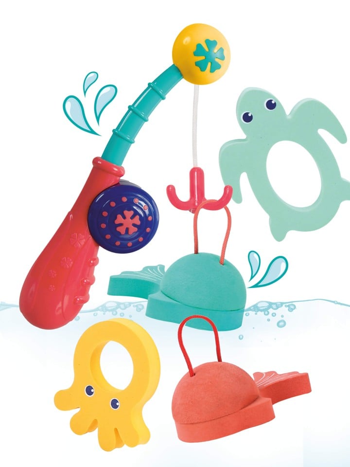 Visspel: Een klassieker voor in bad! Het visspel is een must-have om badtijd nog leuker te maken! Dit spel bevat een houten hengel, vergezeld door twee vissen, een schildpad en een octopus, allemaal gemaakt van zacht en lichtgewicht schuim. Speciaal ontworpen voor kleine handjes, zijn deze waterdieren heel gemakkelijk te vangen en zorgen ze voor een plezierige speelervaring.