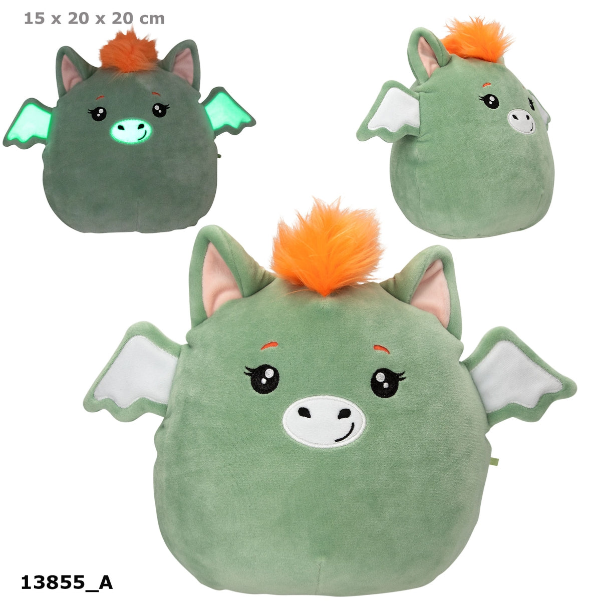 Is het een kussen? Is het een knuffel? Het is een Swoppie! De schattige groene, pluchen draak heeft een lieflijk oranje plukje haar, een geborduurd gezichtje en kleine, gekartelde vleugels. Leuk: de witte delen van de vleugels en snuit lichten op in het donker. Afmetingen: 20 x 20 x 15 cm; Materiaal: 100% PES