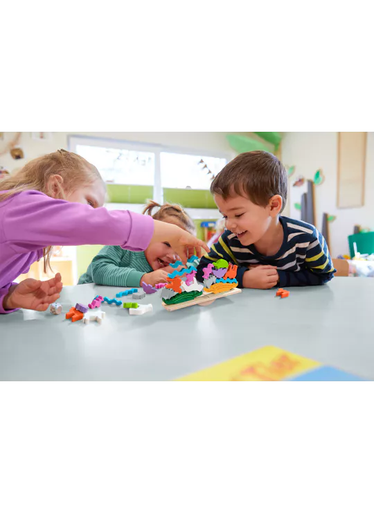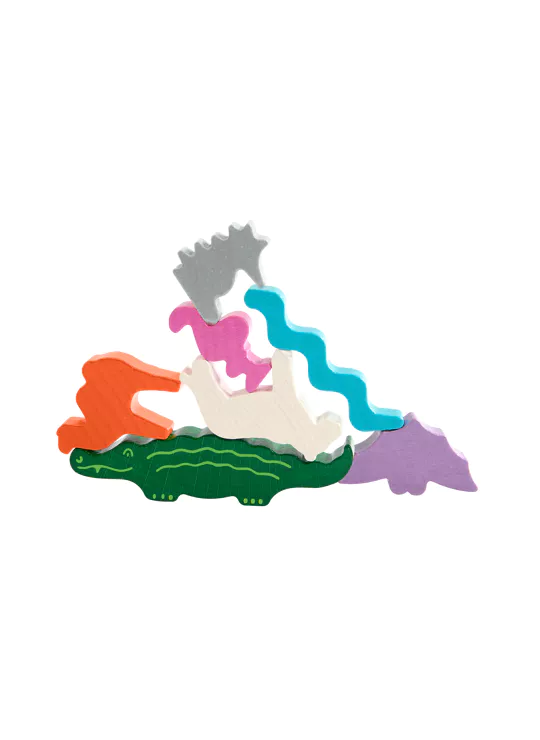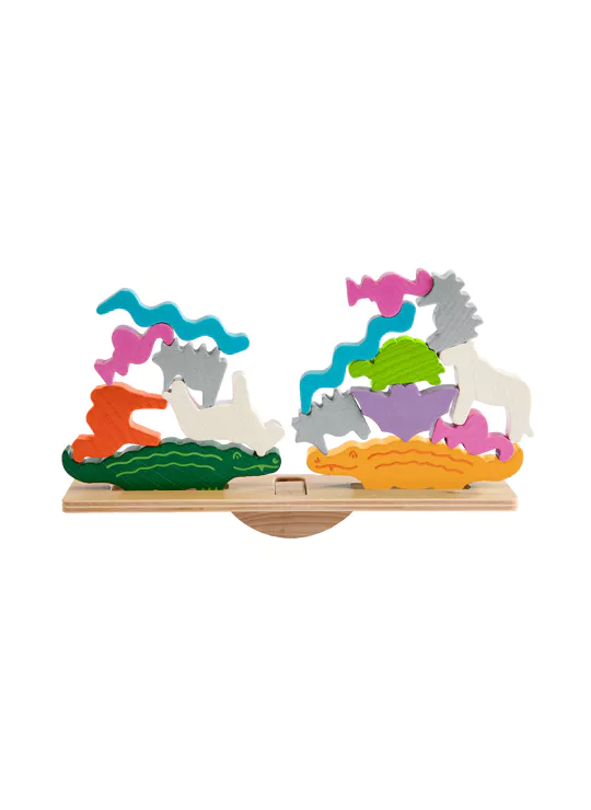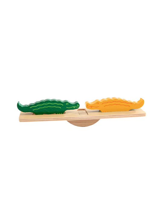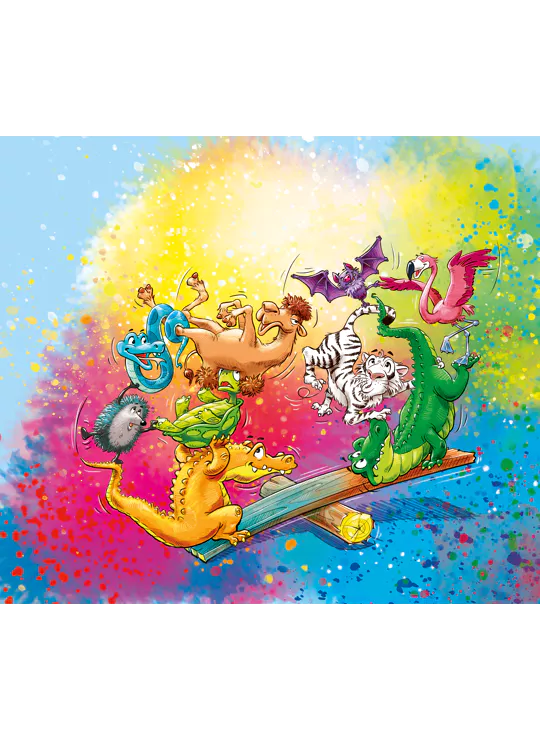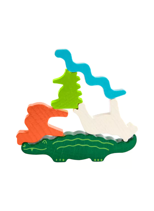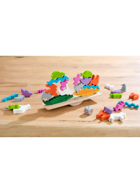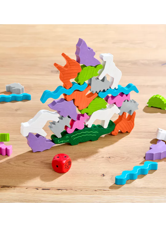 Om dit te vieren, komen alle dieren samen, want ze hebben iets heel bijzonders gepland! Ze klimmen dapper op de wip en vormen twee spectaculaire dierenpiramides – een waarlijk wiebelige aangelegenheid! De krokodillen gaan als eerste. De andere dieren klimmen één voor één omhoog. Dit vereist een zekere finesse. Wie als eerste al zijn dieren op elkaar heeft gestapeld, wint.