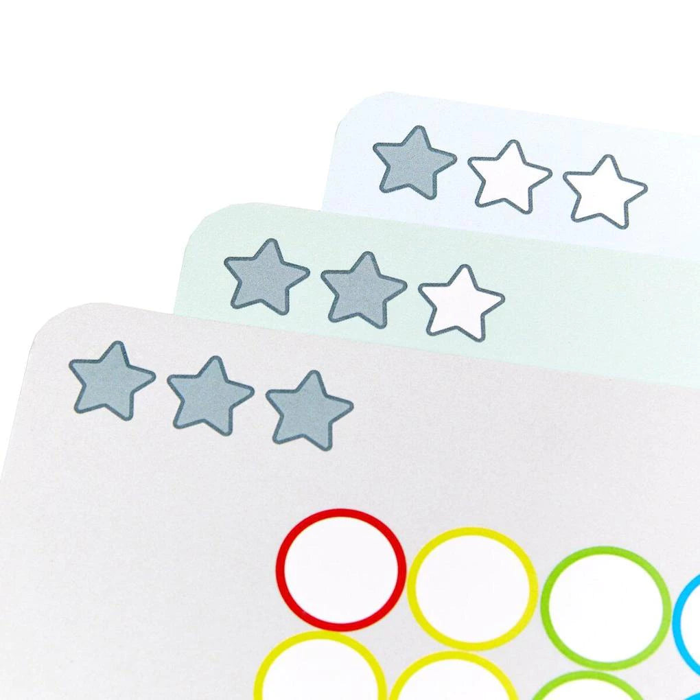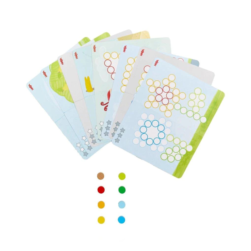 Van eenvoudig tot uitdagend: sommige motieven op de 8 stevige, aan beide zijden bedrukte sjabloonkaarten zijn snel klaar, terwijl je voor andere goed moet kijken en de juiste schijven moet plaatsen.