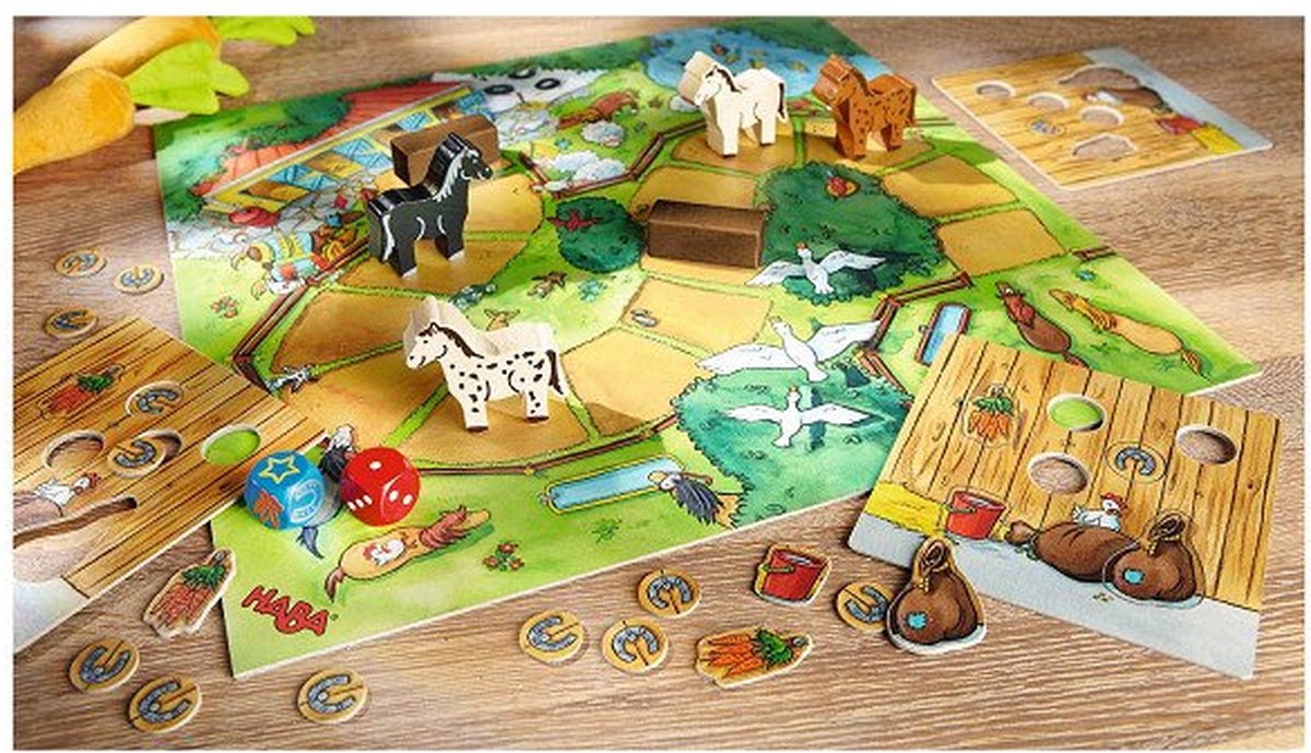 Dat was nog eens een geweldige dag op de wei voor de paarden! Maar nu moeten ze snel terug naar de paardenboerderij. In hun box hebben ze verschillende dingen nodig, zoals een bos wortelen of een zak haver. Deze dingen moeten op weg naar de boerderij worden verzameld. Wie onderweg steeds de juiste dobbelstenen kiest, kan zijn paard met een beetje geluk als eerste naar de box brengen.
