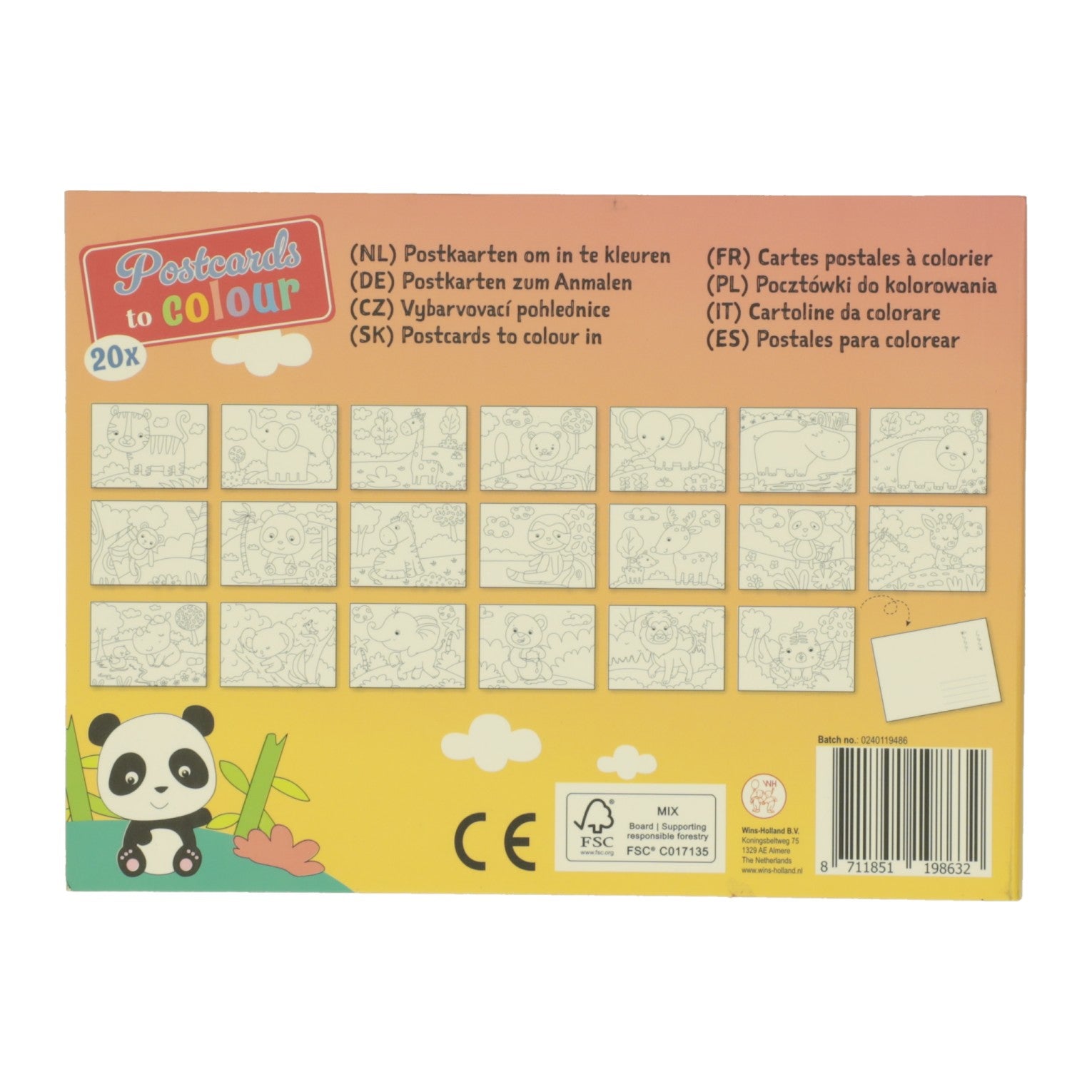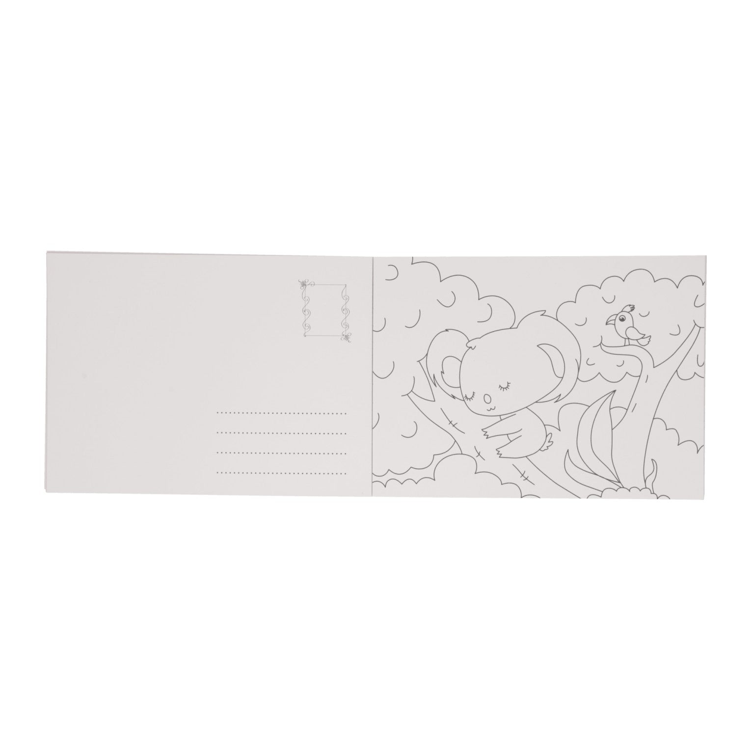 Dit kleurboek bevat verschillende kleine ansichtkaarten, elk met een afbeelding van dieren op de voorkant. Op de achterkant is er ruimte om een tekst te schrijven en een postzegel te plakken.