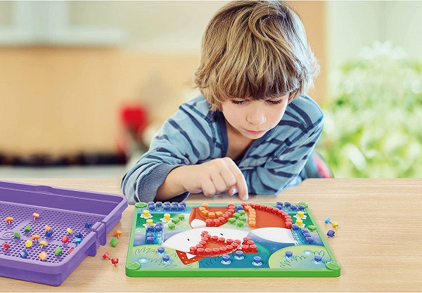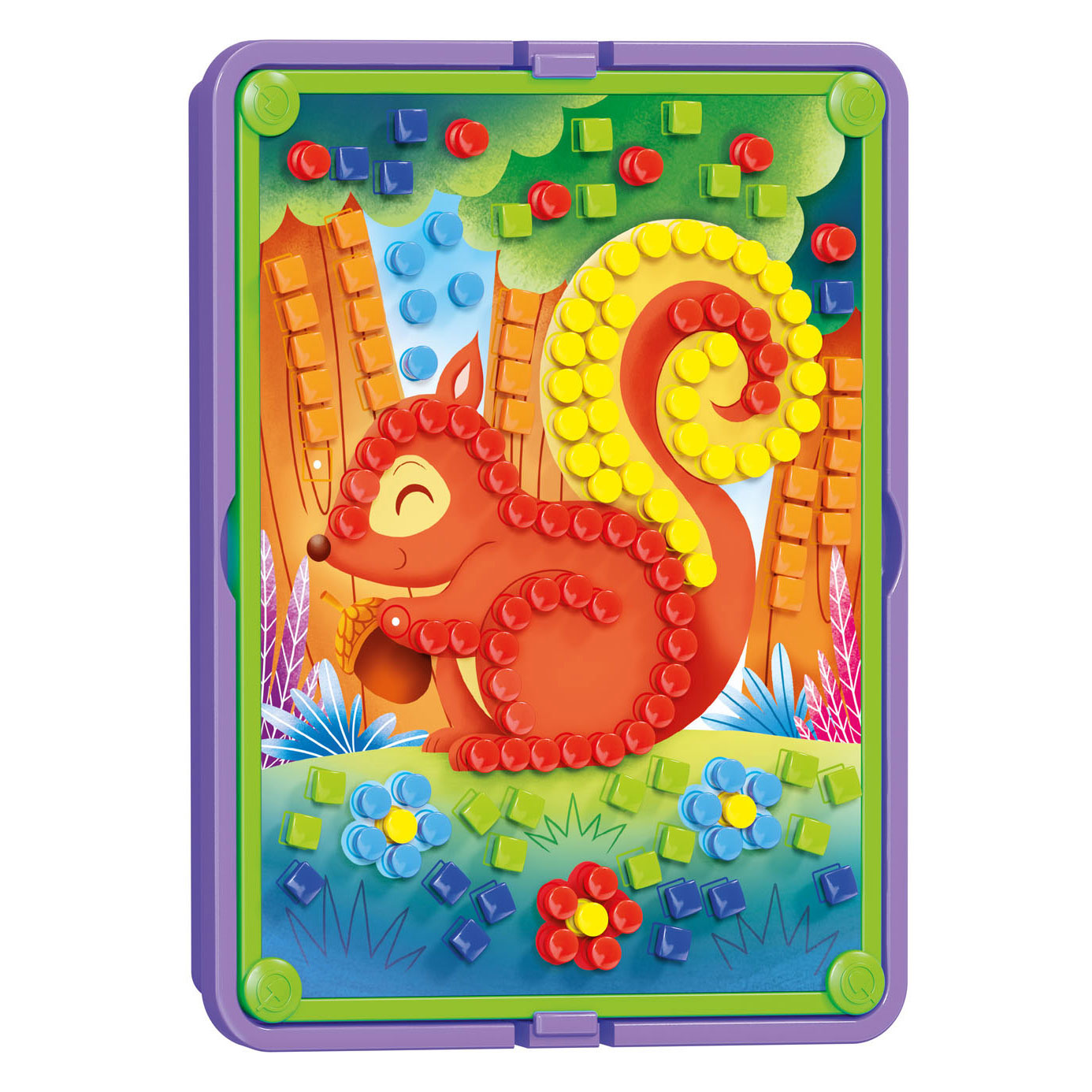 Quercetti insteek mozaïek eekhoorn. Steek de kleurrijke pinnen in de geïllustreerde kaarten en maak spectaculaire mozaïeken. Gebruik de praktische koffer om alles op te bergen na het spelen. Geschikt vanaf 5 jaar.