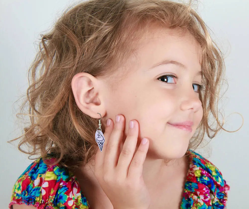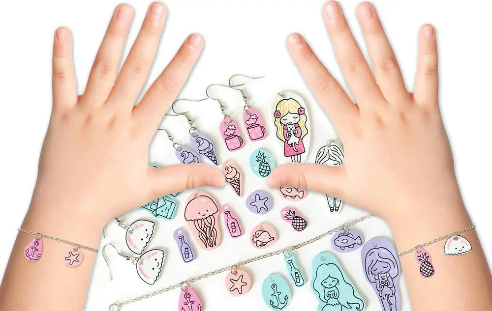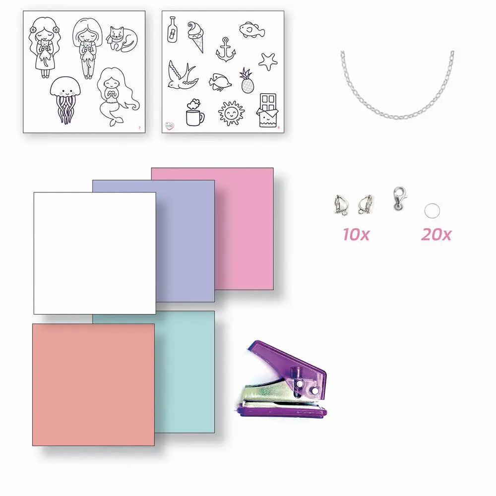 Maak originele krimpfolie sieraden. Deze set bevat: 5 vellen krimpfolie (150x150 mm) in koraal, zeegroen, roze, paars, wit, ringetjes, ketting, 10 sluitingen, oorbellen, perforator en 1 instructieboekje.