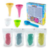 De set bevat: ✔ 4 kleuren zand en vormpjes ✔ 4 kleuren zand (360 g) ✔ 4 vormpjes ijsschep