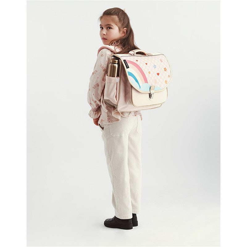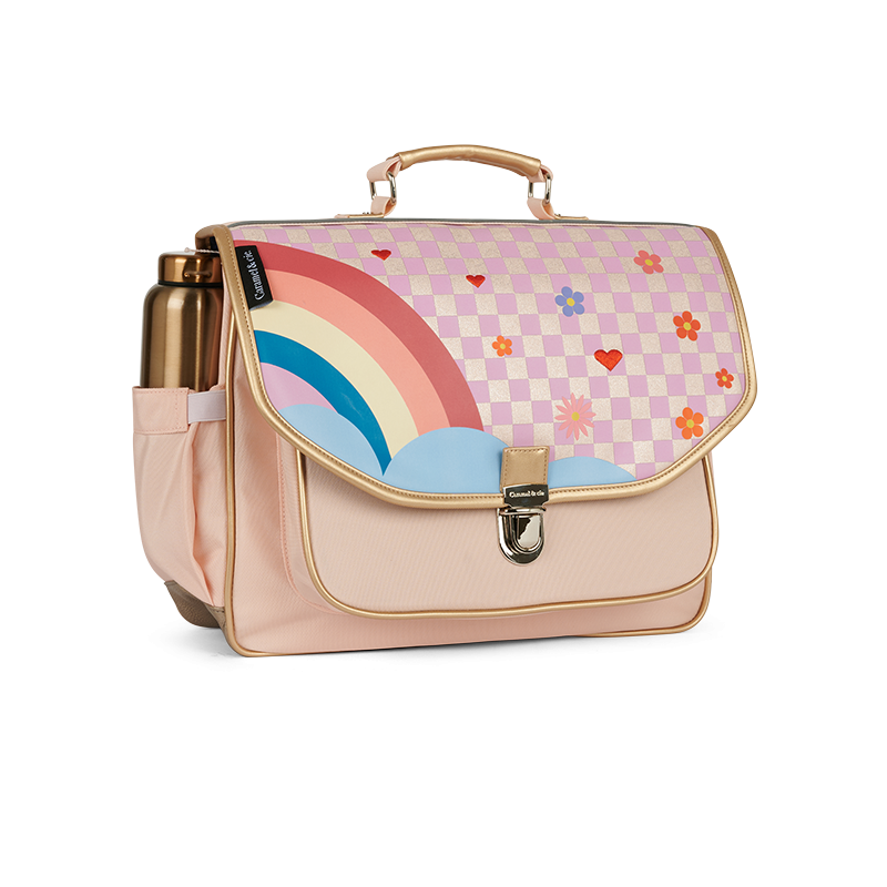 Medium Schooltas Happy Sky Medium schooltas van 38 cm, de beste keuze voor een kind in CP, CE1 en CE2, of met een lichaamslengte tussen 1,10 en 1,30 m. De regenboogprint past bij de kleuren van de hengsels en het roze ruitjespatroon geeft het ontwerp een vitamine-achtige touch.