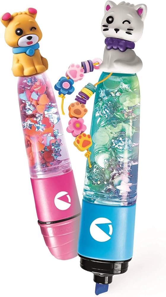 Een originele set waarmee je 2 markeerstiften kunt samenstellen en personaliseren met verschillende decoraties. Een praktische, rijke set met 2 markeerstiften, verschillende kleuren inkt, personages en alles wat je nodig hebt om ze te maken. Nieuw Idea-speelgoed waarmee je je eigen pennen kunt creëren en personaliseren, met een heleboel accessoires en decoraties. Speelgoed waarmee je niet alleen je eigen pen kunt personaliseren. Je kunt hem helemaal zelf creëren en je fantasie de vrije loop laten. Ontwikkeld en ontworpen in Italië. Aanbevolen vanaf 6 jaar.