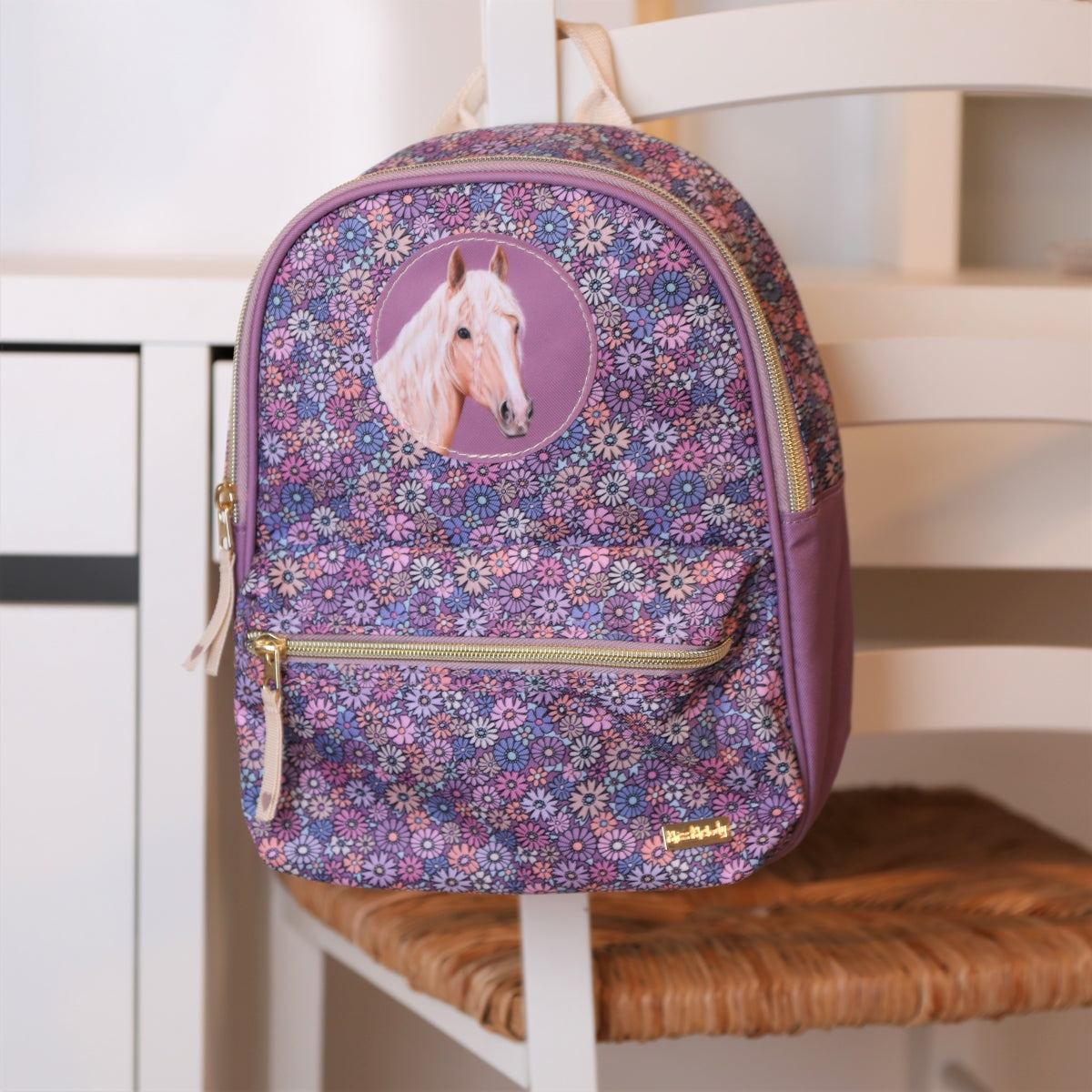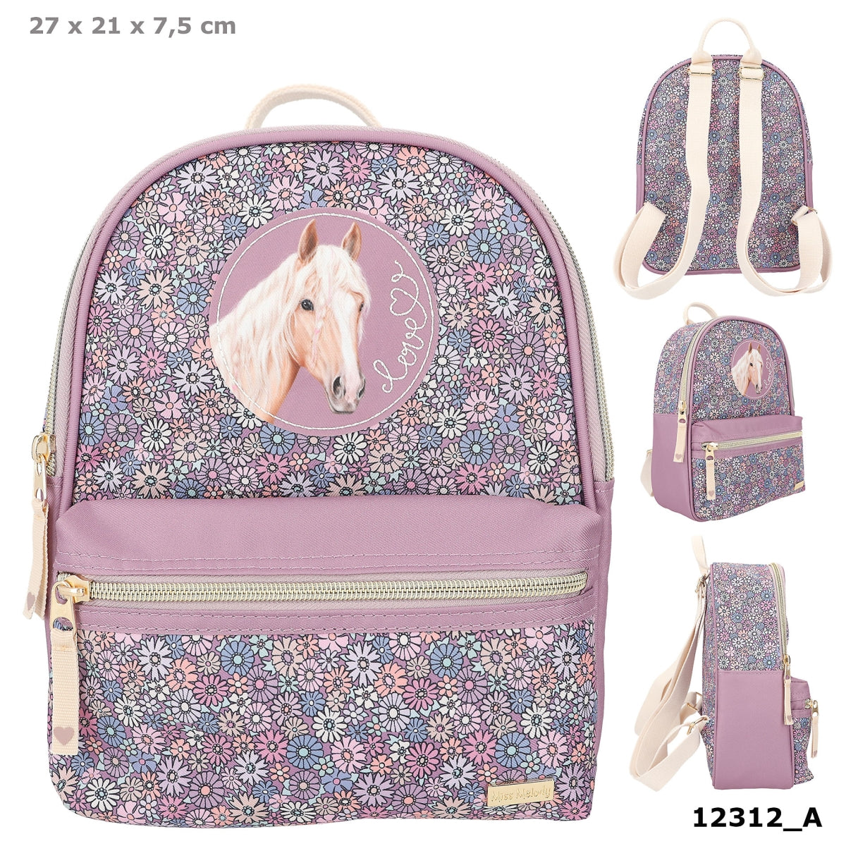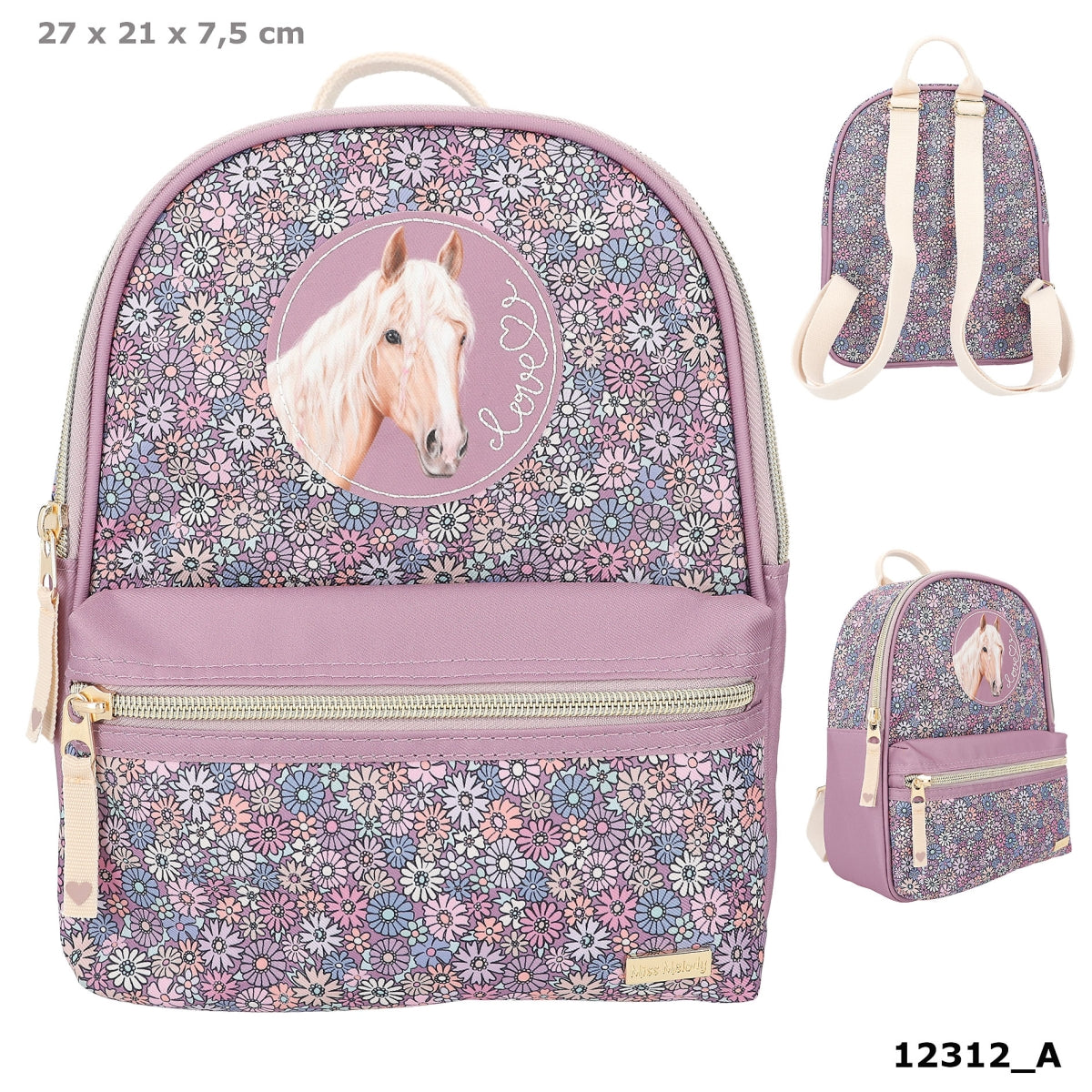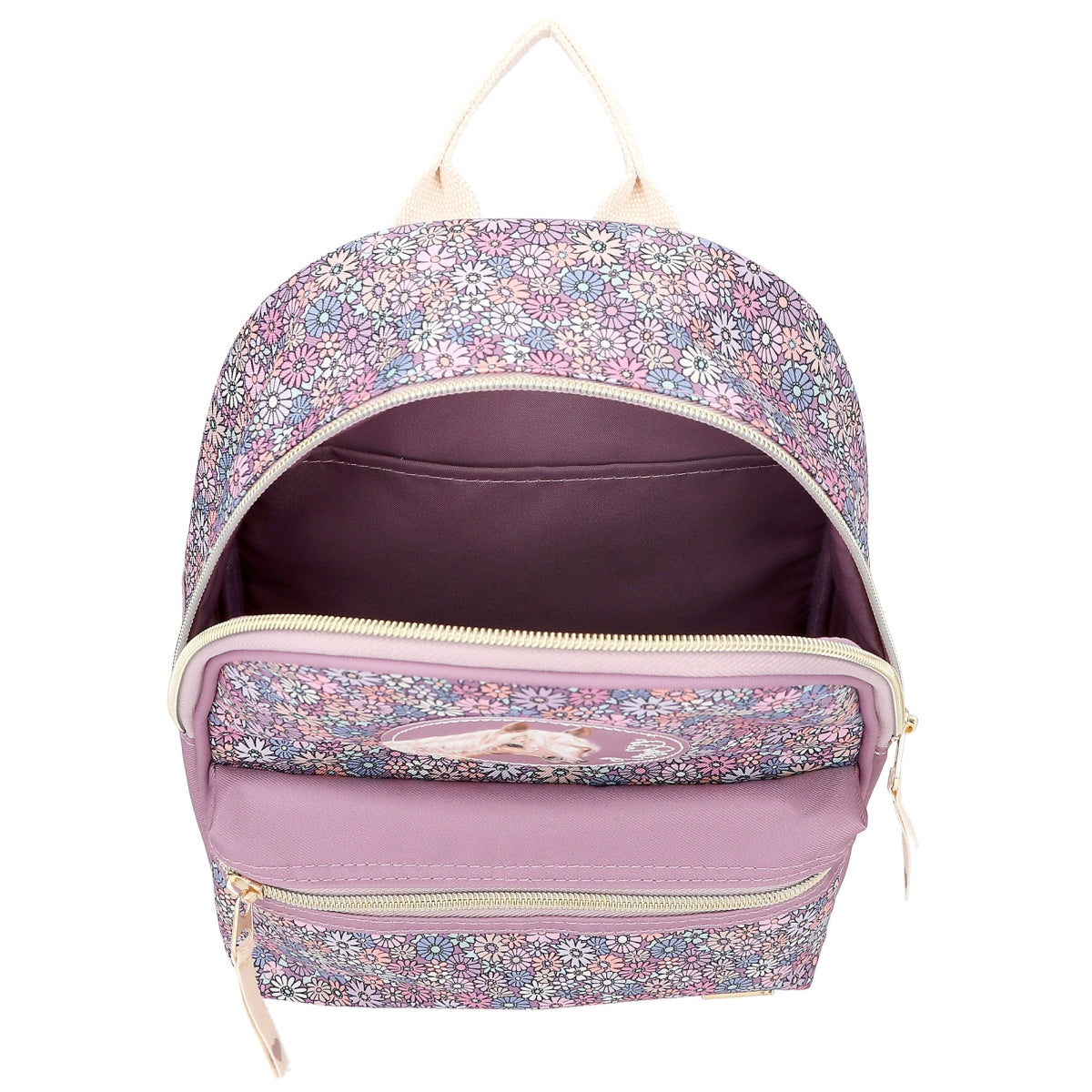 De kleine rugzak van Miss Melody heeft all over een schattige print van bloemen dat perfect past bij de diepe paarse kleur aan de zijkanten en enkele details. Leuke blikvanger: de paardenpatch op de voorkant met de geborduurde tekst Love. De beige draagbanden zijn in lengte verstelbaar en de rugzak heeft een handige draaglus en een apart binnenvakje in het grote hoofdvak. Materiaal: 100 procent polyester; versiering: 100 procent PU; draagband: 100 procent katoen.