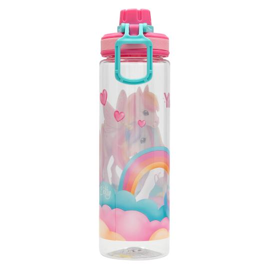 Voor dorstige eenhoornfans: de transparante drinkfles van Ylvi heeft rondom een fleurige afbeelding van een eenhoorn en een gevleugelde pony op wolken. Met handige handgreep (turquoise) en drinksluiting (roze). De fles heeft een inhoud van 700 ml. Vanwege de print wordt wassen met de hand aanbevolen. Niet geschikt voor de magnetron. Materiaal: 100 procent Tritan (stootvast, onbreekbaar, geurloos).