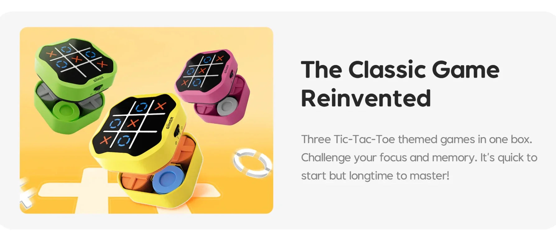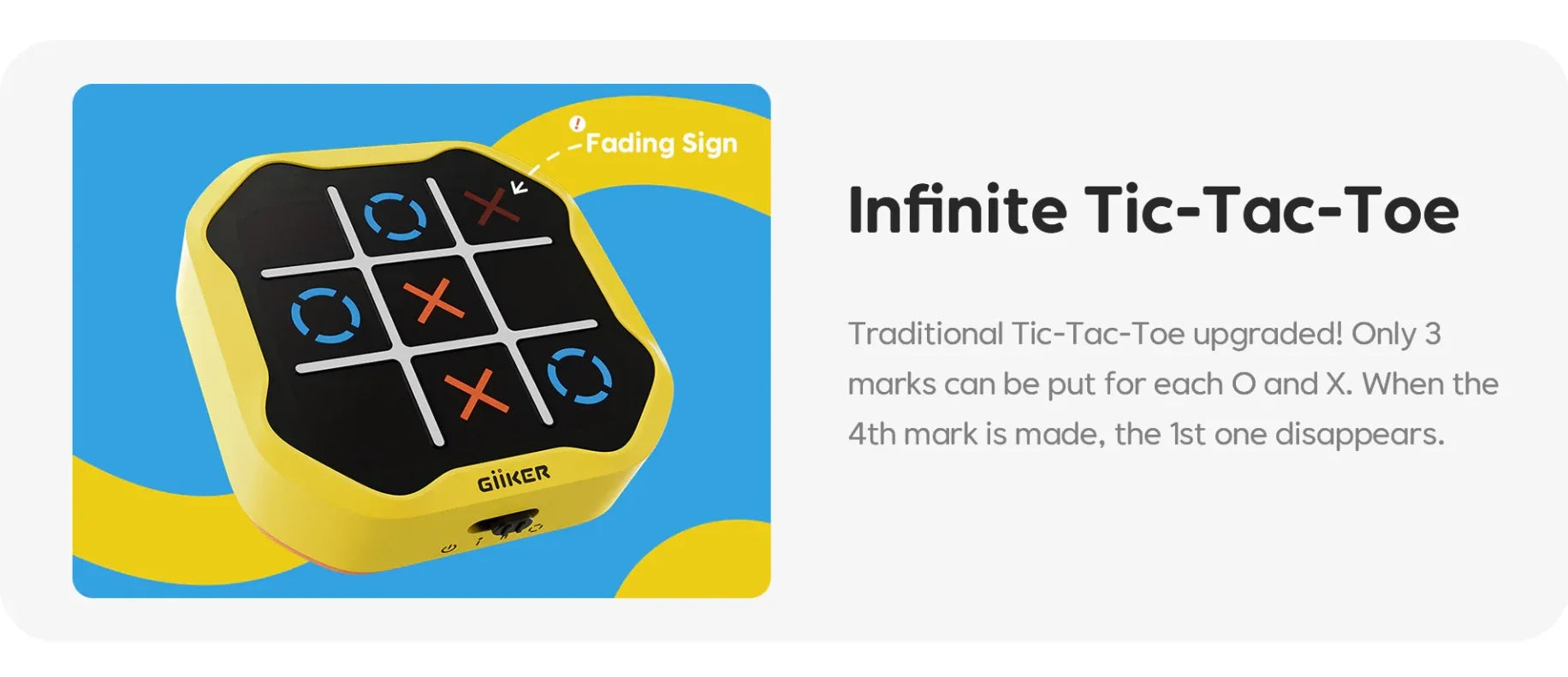 Beleef een nieuwe draai aan het klassieke Boter-kaas-en-eierenspel met het GiiKER Tic Tac Toe smart spel! Deze 3-in-1 spelset biedt eindeloze gameplaymogelijkheden, houdt spelers geboeid en verbetert tegelijkertijd hun focus, geheugen en strategisch denkvermogen.