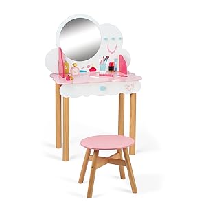 Het is tijd om je klaar te maken om uit te gaan! Met deze houten kaptafel kunnen kinderen vanaf 3 jaar op hun krukje zitten om volwassenen na te doen en zich tegelijk met hen klaar te maken! De kaptafel is echter dan levensecht en is uitgerust met een grote spiegel om jezelf beter te zien en een lade om je spullen in op te bergen en je kleine geheimpjes te verbergen. Praktisch, het heeft 3 haken om je kettingen en armbanden aan op te hangen. Dit kleine meubelstuk zal zijn plaats hebben in de kamer van je kind en zal hem/haar helpen om referentiepunten in te stellen in zijn/haar dag. Elke ochtend of avond kan je kind er een gewoonte van maken om zijn/haar haar voor de kaptafel te borstelen of zijn/haar geheime notitieboekje in de lade te leggen.