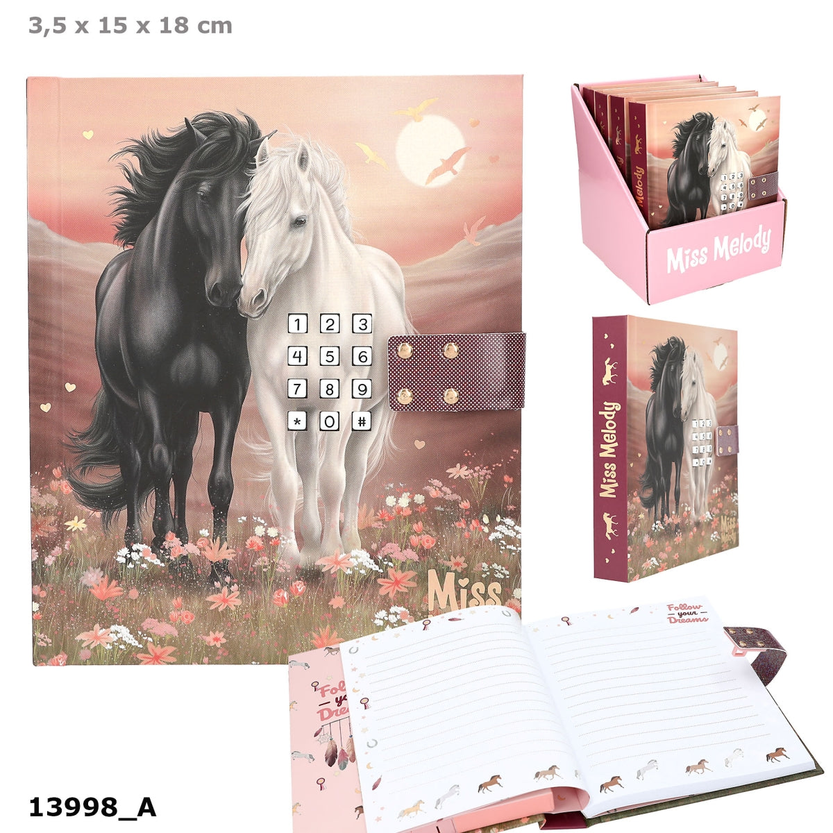 Voor geheime gedachten en belevenissen: Miss Melody's dagboek, in zacht roze en rode tinten, heeft een dromerige afbeelding op de cover van twee paarden in een bloemenweide bij zonsondergang. Het dagboek is ook liefdevol geïllustreerd aan de binnenkant en heeft 80 fijn gelinieerde pagina's. Het slot gaat alleen open wanneer de juiste viercijferige code (persoonlijk in te stellen en te veranderen) wordt ingevoerd. Dan hoor je ca. 20 seconden de hit "Wildest Dreams" van Taylor Swift.