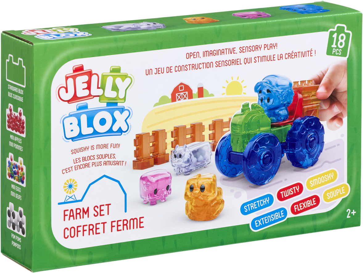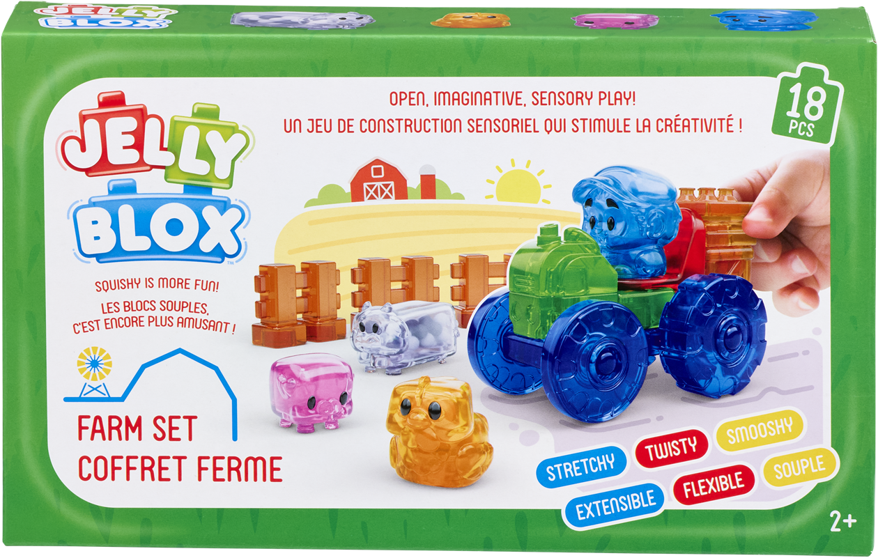 De Boerderij-set bevat 18 onderdelen van zacht, veilig materiaal. De set bevat een figuur van een boer, elementen om een tractor te bouwen en zelfs dierenfiguren, zodat de allerkleinsten scenario's kunnen naspelen en hun eigen verhalen kunnen bedenken met Jelly Blox-blokken!