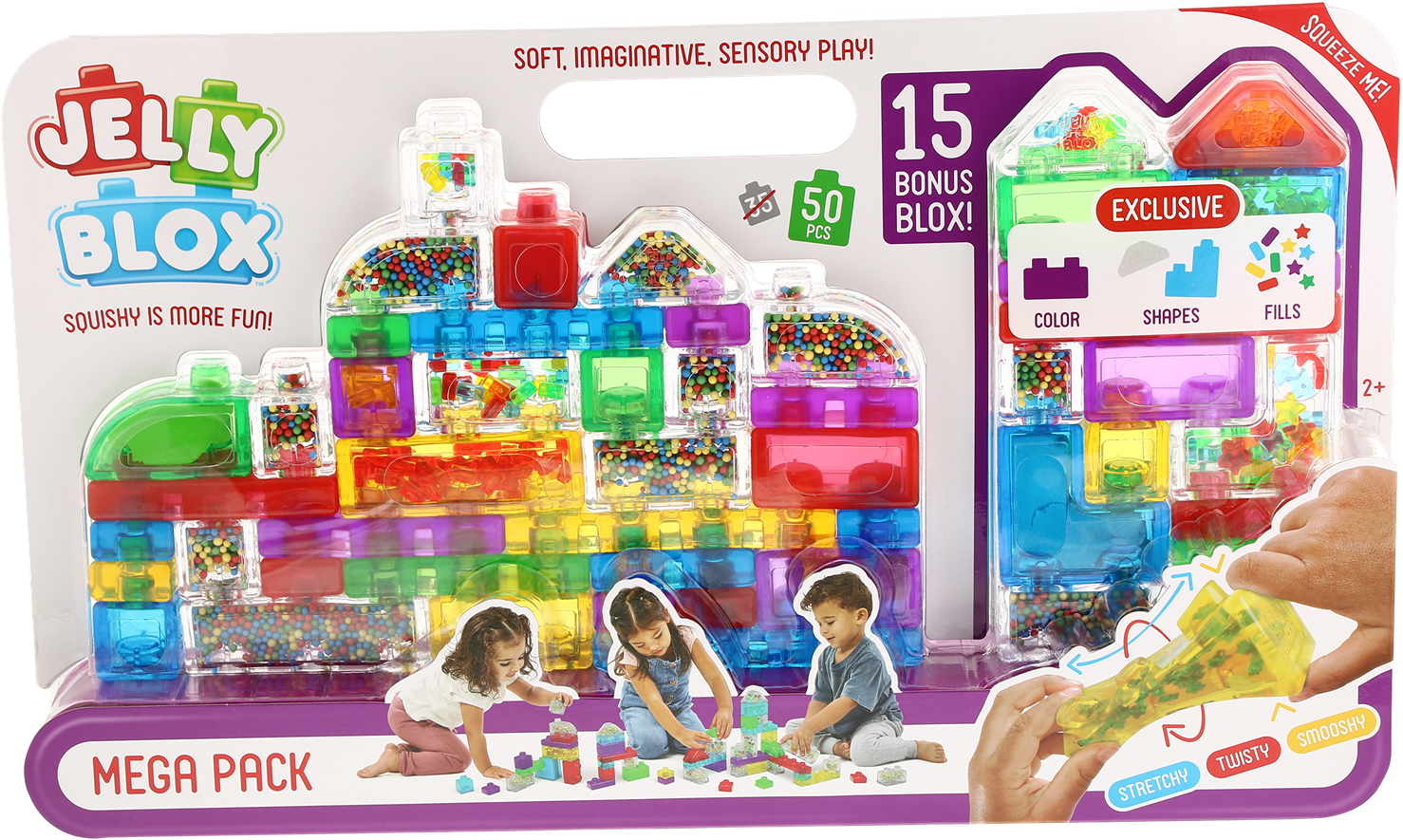 Laat de verbeelding van kinderen tot leven komen met Jelly Blox! Met de zachte blokken Jelly Blox kunnen kinderen bouwen, knijpen en zelfs platdrukken. Sommige blokken zijn gevuld met materialen zoals zand, blokjes of schuimballetjes die de zintuigen stimuleren en de sensorische tactiliteit bevorderen. Met deze Mega Pack krijg je 50 blokken om mee te bouwen. Deze set bevat ook exclusieve blokken die niet in de andere sets te vinden zijn!