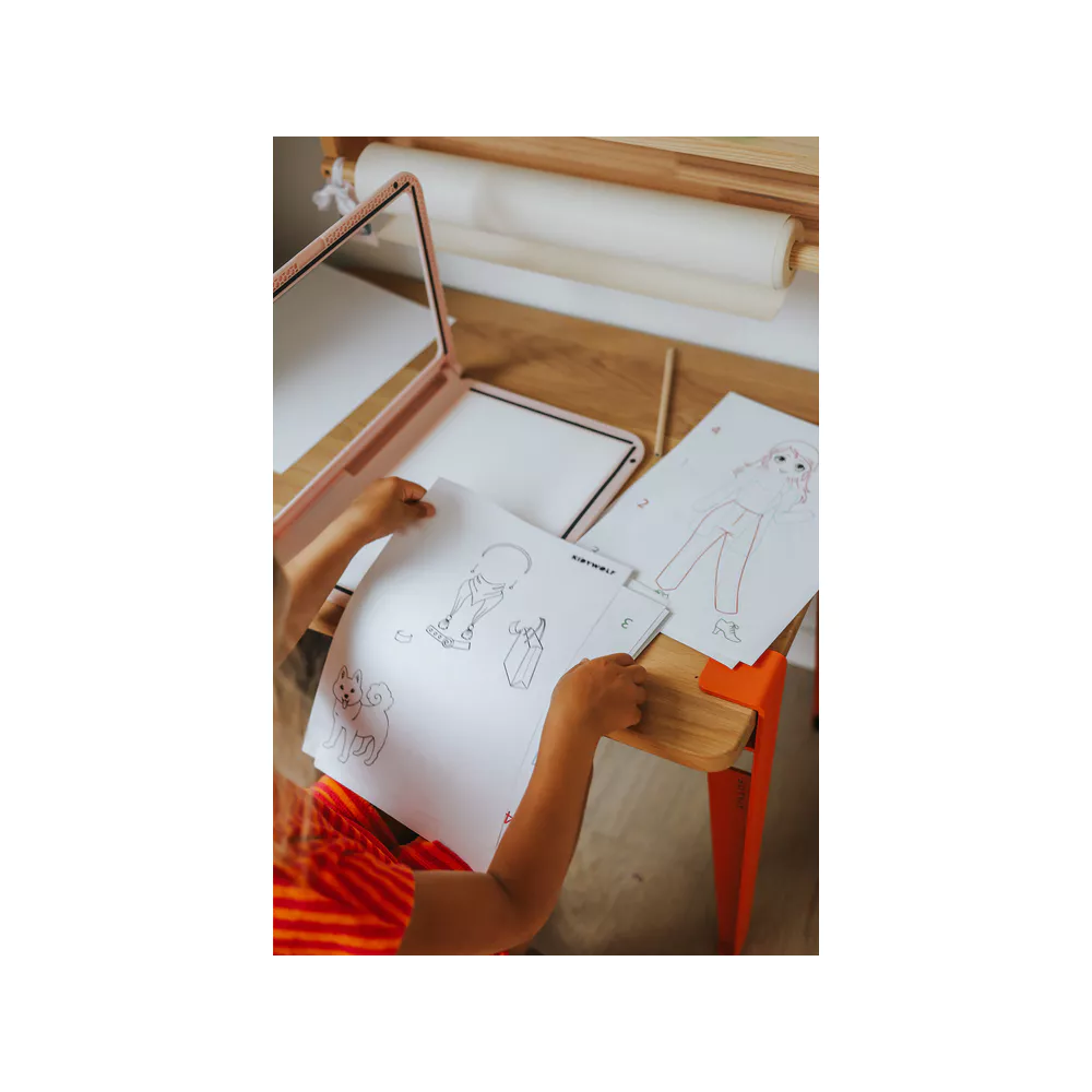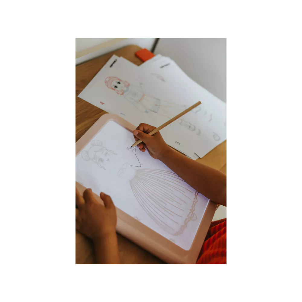 Met KIDYDRAW PRO worden kinderen echte stylisten in spe. Dankzij een ingenieus systeem van stickers kunnen ze silhouetten, outfits, accessoires en motieven eindeloos combineren – meer dan 1000 combinaties zijn mogelijk, net als in een echt modeatelier. Het lichtbord is dubbelzijdig en biedt ruimte voor vrije, leuke en creatieve expressie.