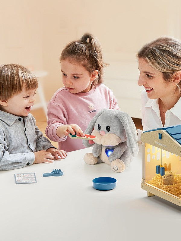 Maak kennis met Mummy Bunny – een interactief, knuffelzacht konijn dat reageert op jouw liefde en zorg! Voer haar, troost haar en help haar zich beter te voelen door leuke taakjes uit te voeren. Zodra je genoeg voor haar hebt gezorgd, plaats je haar in het hokje… en na een paar magische minuten verschijnt er een verrassing: een schattige baby bunny!