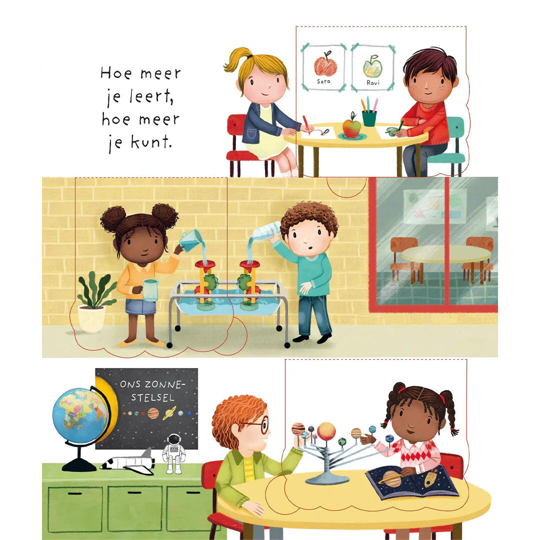 Je maakt er nieuwe vrienden en leert er nieuwe dingen: een groep kinderen laat zien hoe het is om op school te zitten. Flapjesboek met illustraties van Marta Álvarez Miguéns. Geeft kinderen die het moeilijk vinden om naar school te gaan een duwtje in de rug. Met knappe flapjes en een knipoog, voor jonge lezers.